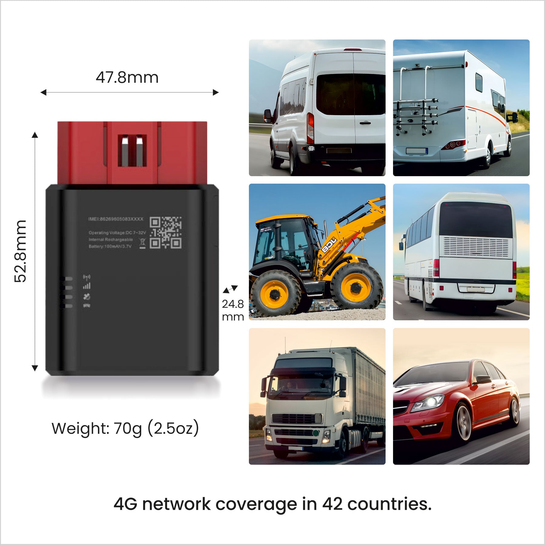 Compatible with trucks, vans, cars, and buses. Supports both heavy duty vehicles (HGVs, lorries) and light duty vehicles (cars, vans). Universal OBD2 compatibility for comprehensive fleet tracking solutions.