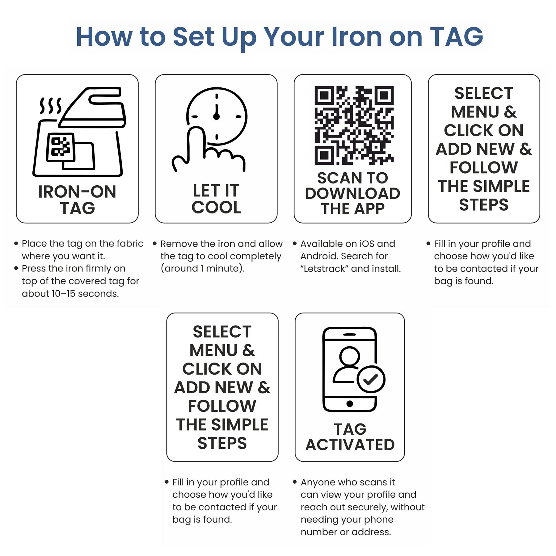 Letstrack Iron-on TAG is a durable, washable, heat activated smart label for clothes, uniforms, travel gear and sports wear. With built in QR tech, anyone can scan to access your profile. Ideal for school wear, work apparel, or emergency contacts. No batteries, peeling, or fading, upto 200 washes.