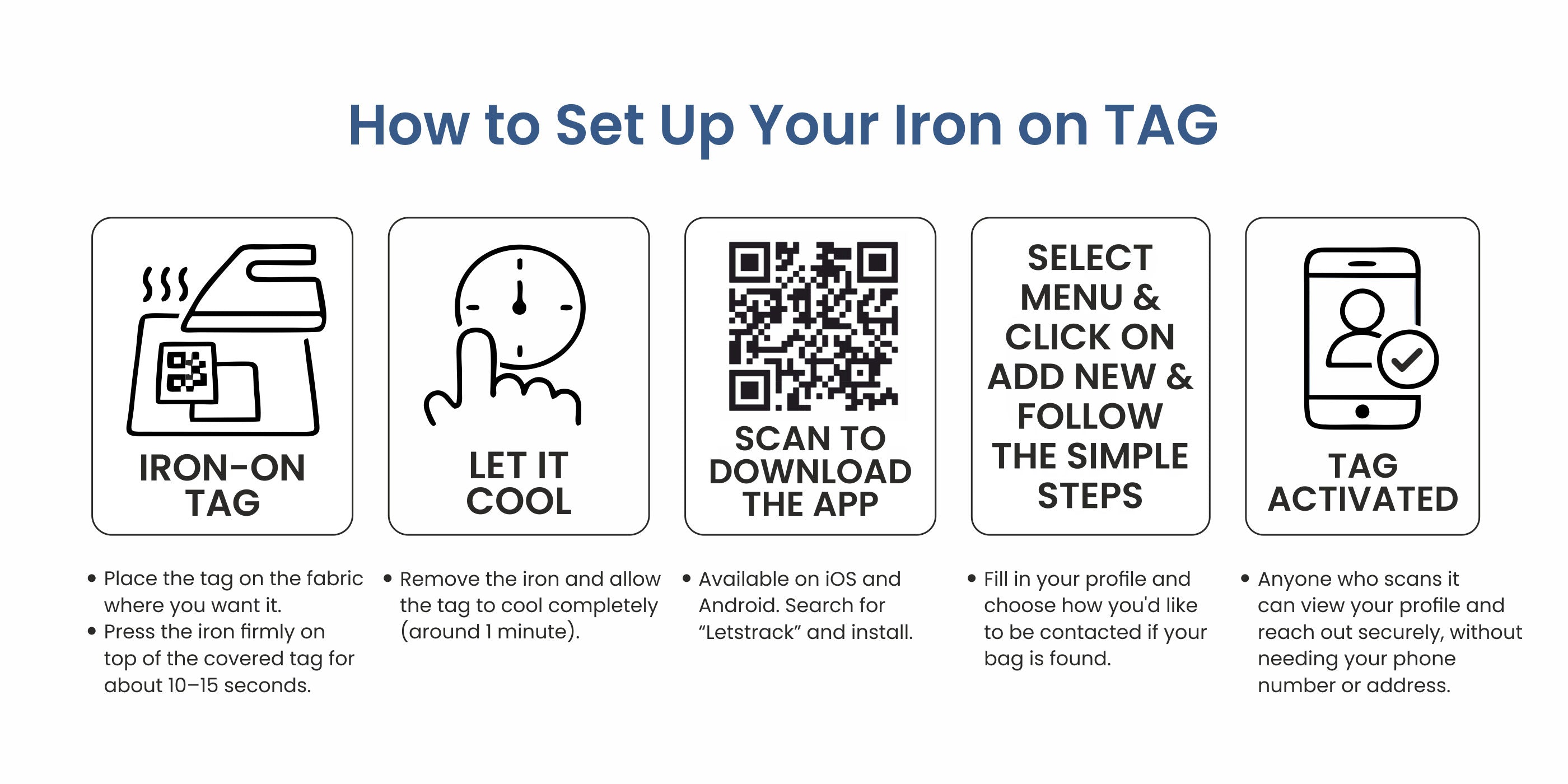 Quick, simple, and permanent protection. Place the tag on fabric where you want it. Press iron firmly on top of the covered tag for about 10 to 15 seconds. Remove iron and allow the tag to cool completely (around 1 minute). Quick setup, permanent bond. - Instant Scan & Location Alerts