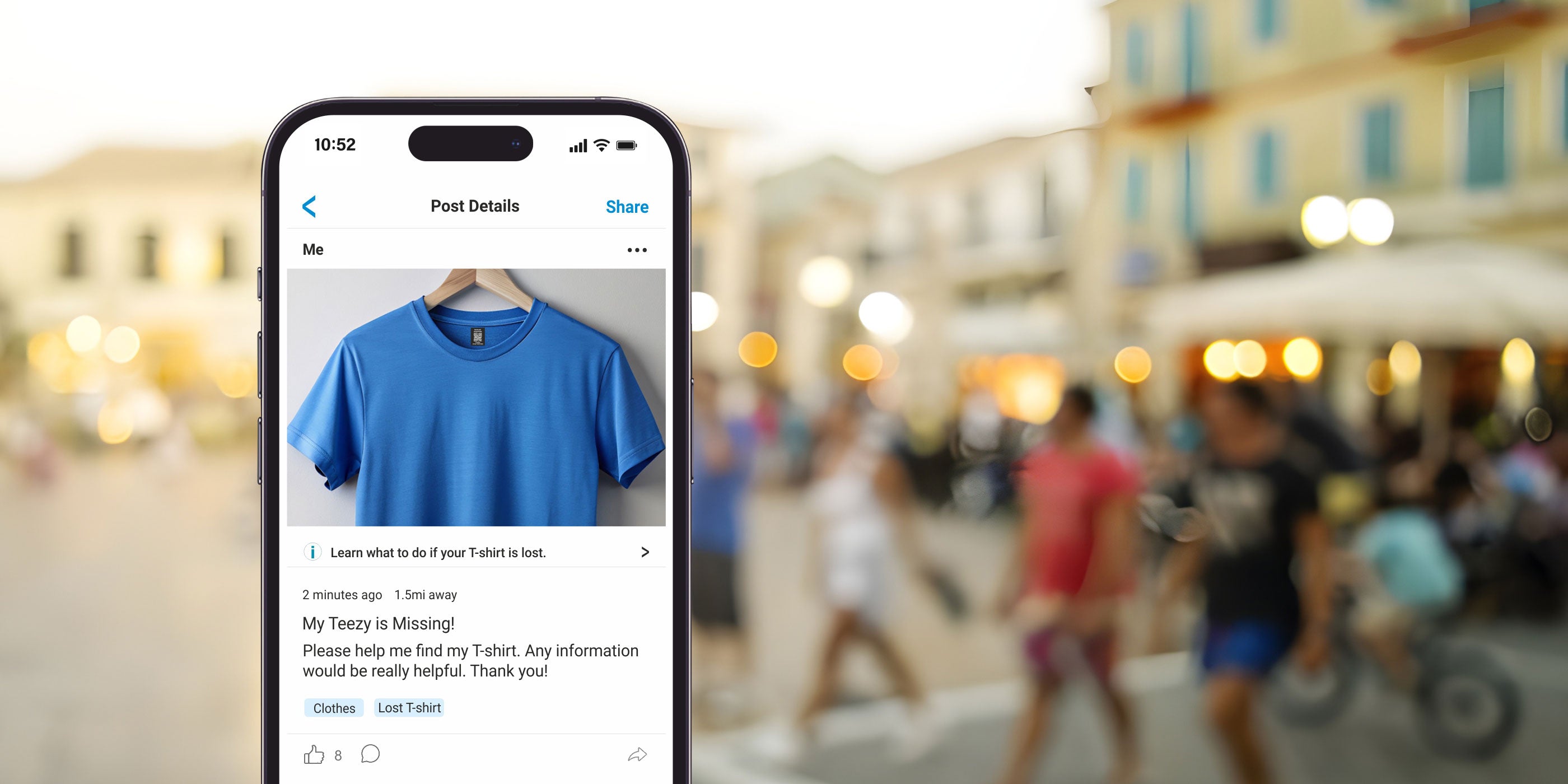 If your clothes goes missing, Letstrack instantly creates a post with its picture and last known location, so nearby travellers can help through WhatsApp, Facebook, Instagram, Nextdoor, or any platform you choose.